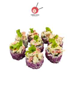 Рис для суши, нори, фиолетовая крошка, сливочный сыр, огурцы, авокадо, лосось, соус кимчи, тобико васаби, кунжут