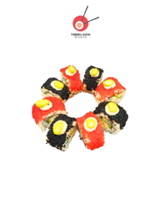 Нори, рис для суши, тобико васаби, оранжевый тобико, кунжут, запечённые овощи, огурцы, угорь кабаяки, соевый майонез, соус кабаяки, хрустящая крошка