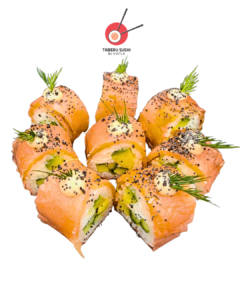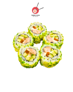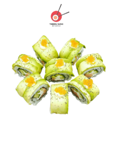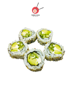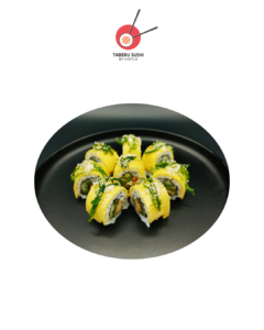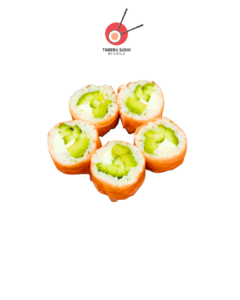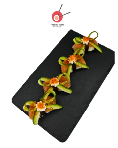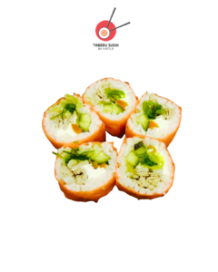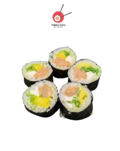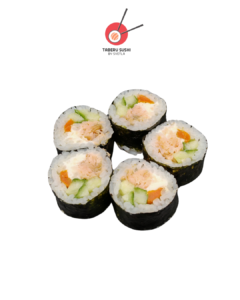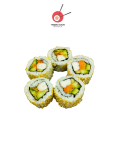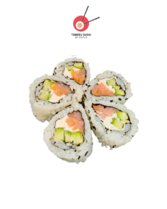Нори, рис для суши, сливочный сыр, копчёный лосось, огурцы, авокадо, соус Такара, тобико юдзу