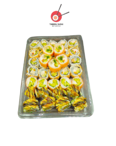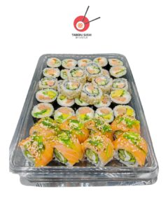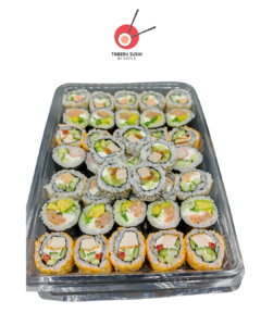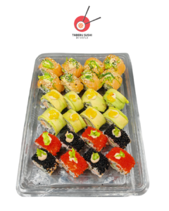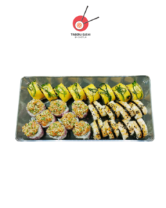 Урамаки хрустящая курица – 10 шт., урамаки запечённый лосось – 10 шт., футомаки лосось холодного копчения – 10 шт., урамаки тунец – 5 шт., футомаки крабовые палочки – 5 шт.