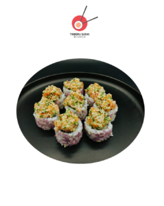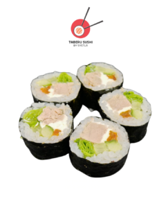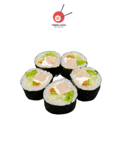 Нори, рис для суши, сливочный сыр, огурец, зелёный салат, васаби, тунец, соус Такара, соус срирача, чили тогараши