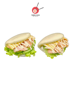 Булочка Бао Бун на пару, сливочный сыр, зелёный салат, огурец, копчёный лосось, чеддер, соус