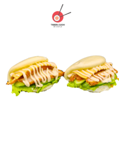 Булочка Бао Бун на пару, сливочный сыр, зелёный салат, огурец, панированная курица, чеддер, соус