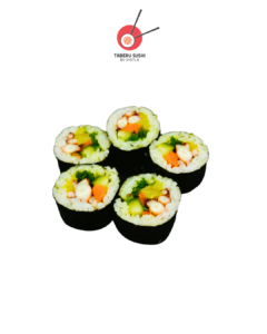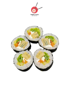 Нори, рис для суши, курица терияки, запечённые овощи, огурец, чеддер, соус кимчи, вакаме, воздушный амарант
